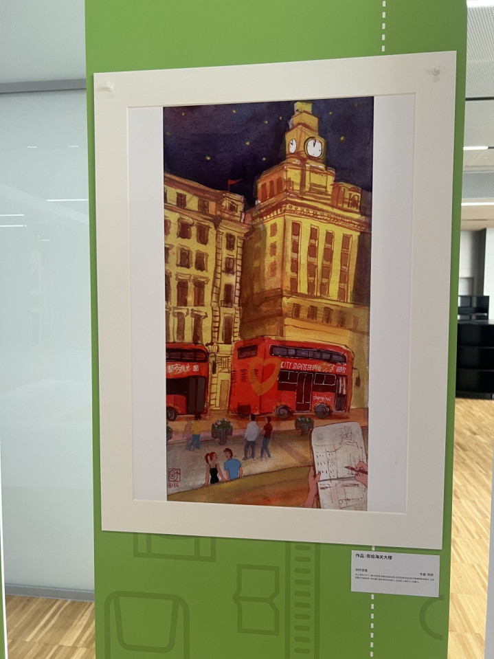 插画师阿舒则仅仅用一张投稿作品就入选了展览,那是一个月前她在外滩绘制的一幅水彩《夜绘海关大楼》,从地铁2号线南京东路出站,走不远就可以看到这幢历史建筑。画面上,海关大楼的钟楼指针指向晚上11点,右下角画出的是一双手在速写本上绘制草稿,“这就是我自己在画画。”阿舒已经来上海生活十几年,外滩的万国建筑群一直是她深爱的风景,一个多月前,她又来到外滩描绘海关大楼,到晚上11点,所有灯突然熄灭,速写本上的画只完成了三分之一,阿舒回到家完成了剩余的画面,也把当时那张未完成的速写本添加在了画面中,那是属于她的城市记忆。
