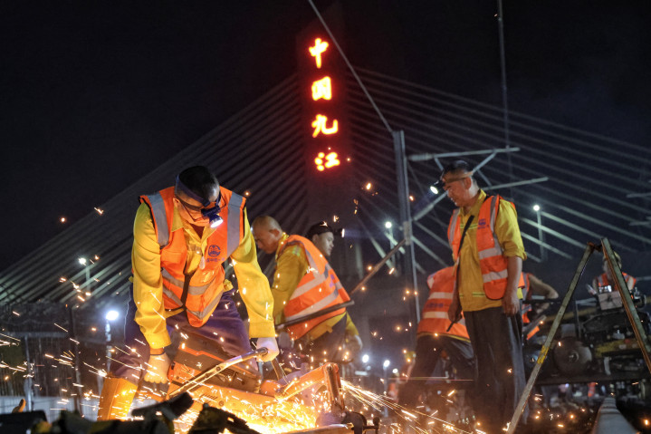 这是施工作业人员在切割钢轨。新华社发(陈平摄)